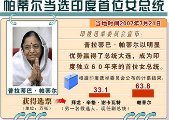 7月21日印度选举委员会宣布,现年72岁的普拉蒂巴·帕蒂尔以明显优势击败全国民主联盟候选人谢卡瓦特,赢得了总统大选,成为印度独立60年来的首位女总统,这位有争议的总统将于今日宣誓就职。