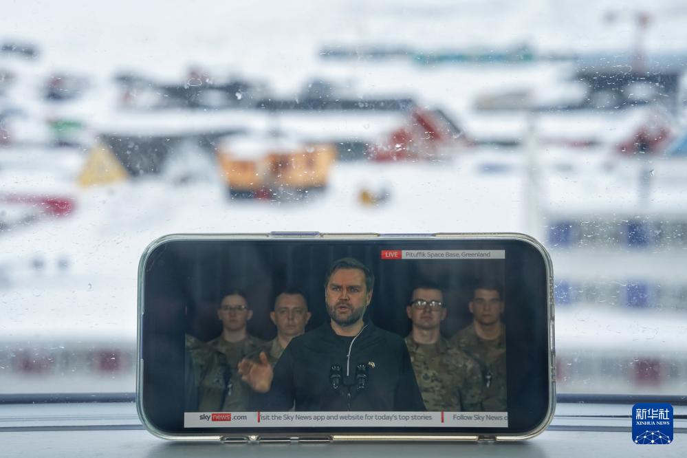 这是3月28日在丹麦自治领地格陵兰岛首府努克拍摄的美国副总统万斯讲话的直播画面。新华社记者 彭子洋 摄