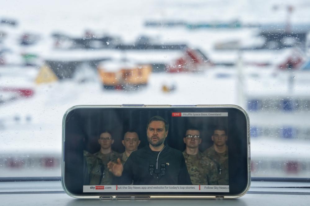 这是3月28日在丹麦自治领地格陵兰岛首府努克拍摄的美国副总统万斯讲话的直播画面。新华社记者彭子洋摄