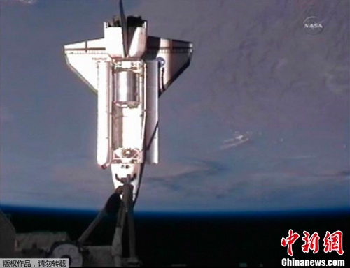 由NASA公布的视频截图显示,美国东部时间7月10日11时,经过近两天的飞行后,“亚特兰蒂斯”号航天飞机与国际空间站“和谐”号节点舱对接。“亚特兰蒂斯”号7月8日从佛罗里达州肯尼迪航天中心升空,执行美国航天飞机项目第135次也是最后一次飞行,其任务期为12天,主要任务是为空间站运送一年的给养。