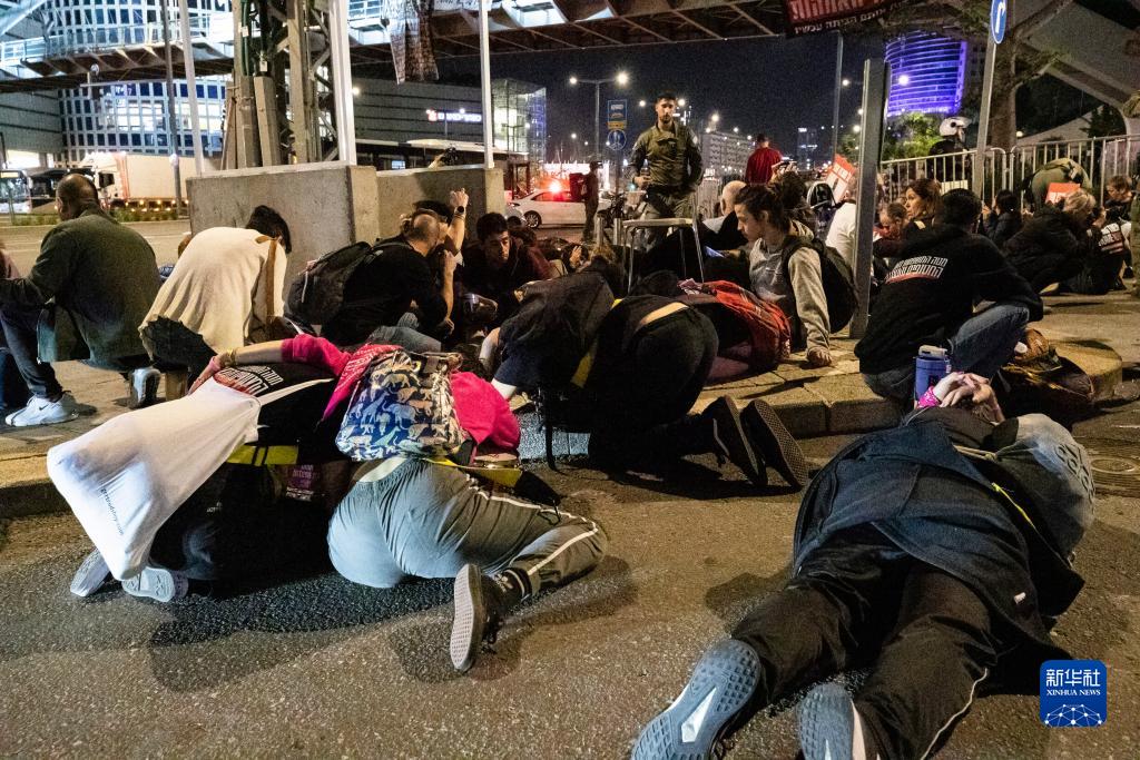 12月2日,在以色列城市特拉维夫,防空警报响起时,身处室外的人们降低身位避难。