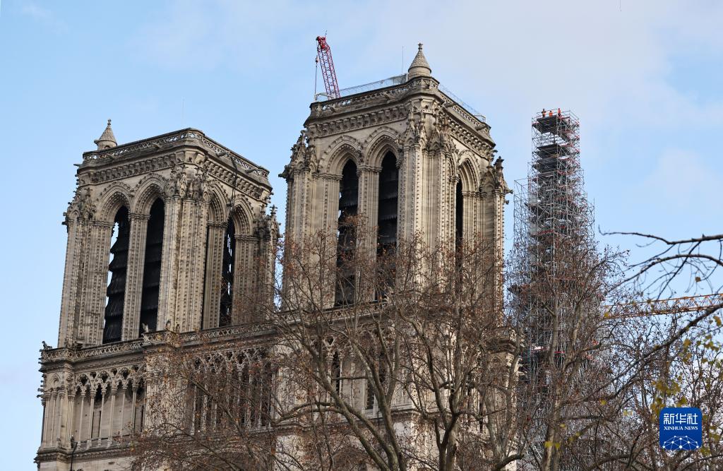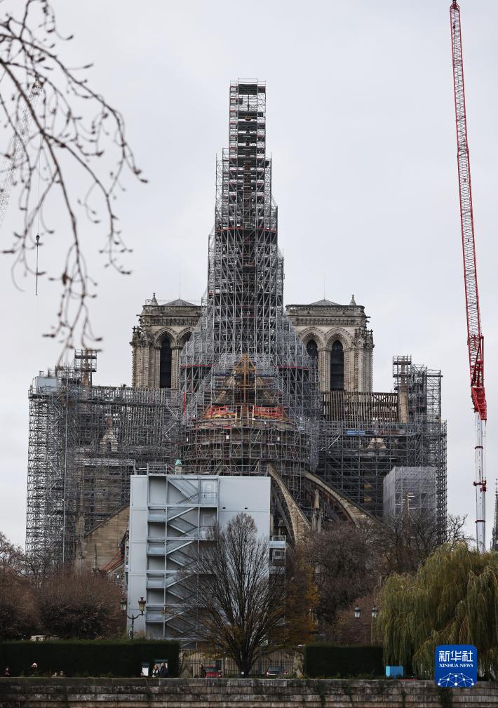 这是12月8日在法国巴黎拍摄的修复中的巴黎圣母院。法国总统马克龙8日对媒体表示,2019年失火的巴黎圣母院将于2024年12月8日如期重新对宗教活动及公众开放。新华社记者 高静 摄