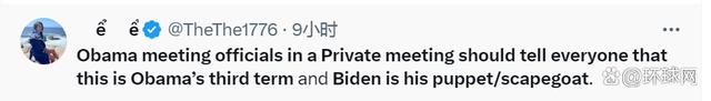 有X用户认为,这是奥巴马在寻求第三任期。“奥巴马在私人会议上会见官员应该是在告诉每个人,这是奥巴马的第三个任期,拜登是他的傀儡或是替罪羊。”