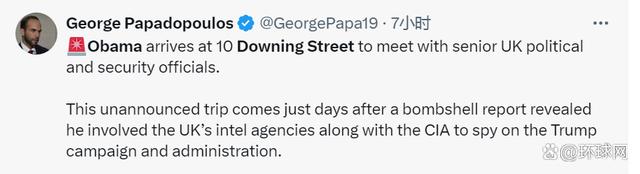 也有人提到,“奥巴马抵达唐宁街10号,会见英国高级政治和安全官员。就在几天前,一则令人震惊的报道披露,他参与了英国情报机构和美国中央情报局(CIA)对特朗普竞选和政府的监视。”有网友为此附和道,他“准备再来一次。”