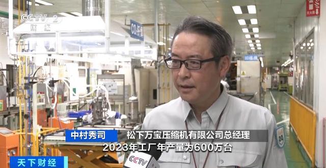 松下万宝压缩机有限公司总经理 中村秀司:这两年(工厂)压缩机的生产一直在扩产,和2023年相比增长了30%左右。2023年工厂的年产量为600万台,今年计划增长到900万台,工厂员工人数从2023年的2500人,增长到目前的3500人。