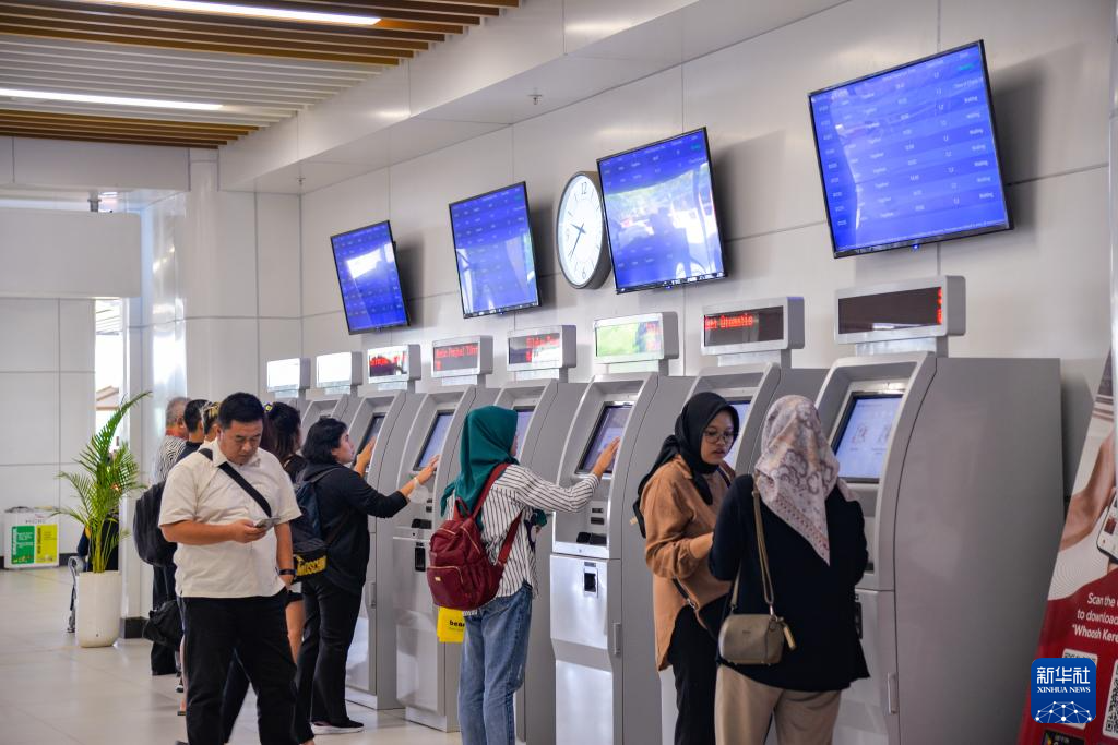 7月17日,乘客在印度尼西亚雅加达哈利姆站的自助取票机前取票。