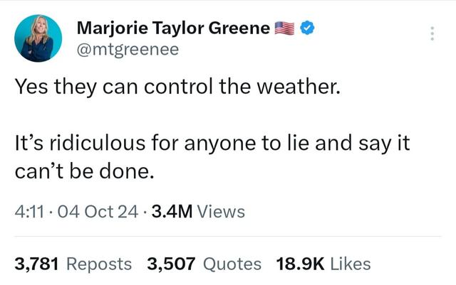 这一言论出自佐治亚州联邦众议员玛乔丽·泰勒·格林之口,此人也是共和党“让美国再次伟大”(MAGA)派代表人物之一。她在社交媒体X上发帖说:“‘他们’可以控制天气。”暗戳戳地指责拜登的民主党政府通过将天灾引向共和党票仓来影响大选。她还贴出“海伦妮”受灾地区的地图,包括佛罗里达州、佐治亚州和北卡罗来纳州。这些地区大多是共和党票仓。