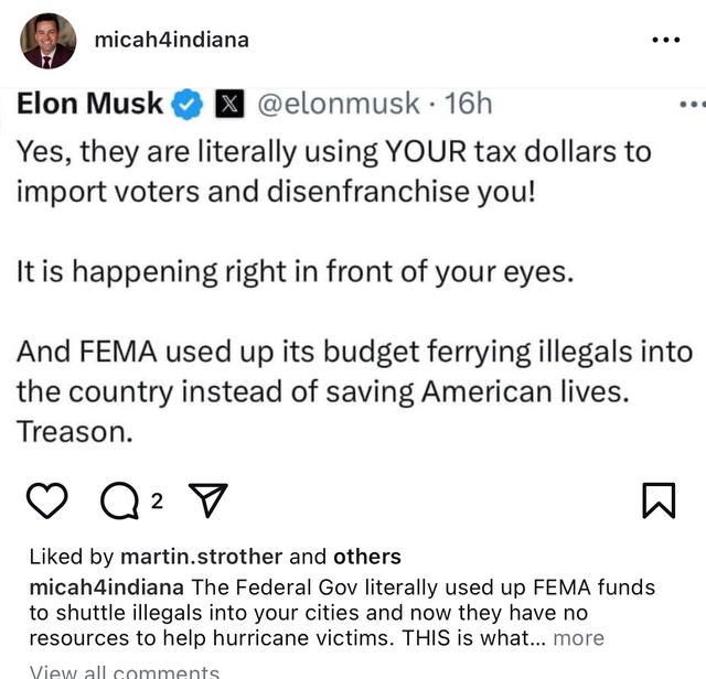 公开支持特朗普的马斯克也加入了战斗。他在X平台发帖称:“联邦紧急事务管理局(FEMA)用尽了预算把非法移民运入美国,而不是拯救美国人的生命。(这就是)叛国。”