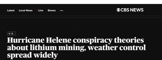 另一位著名的右翼阴谋论者亚历克斯·琼斯则宣称,拜登当局将飓风“海伦妮”引到北卡罗来纳州是为了“将居民赶走”,“好让政府能在此开采用于电动汽车电池的锂矿”。