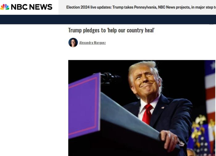 NBC报道称,在演讲中,特朗普承诺“帮助我们的国家治愈伤痛。”