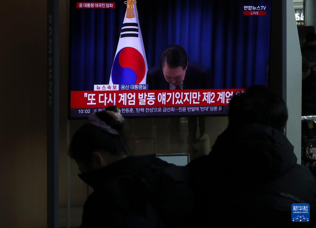 12月7日,在韩国首尔火车站,民众观看总统尹锡悦发表讲话的电视画面。新华社记者 姚琪琳 摄