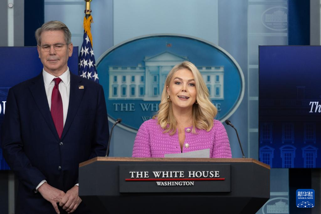 4月29日,美国白宫新闻秘书卡罗琳·莱维特(右)与美国财政部长斯科特·贝森特在华盛顿白宫出席记者会。新华社记者 胡友松 摄