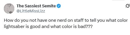 帖文翻译:怎么就没有一个懂行的员工来告诉你们哪种颜色的光剑代表着好、哪种颜色的光剑代表着坏???