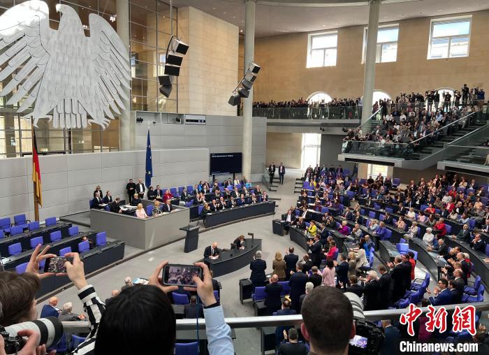 当地时间5月6日,德国联邦议院召开全体会议选举新总理。在当日下午举行的第二轮总理选举中,德国联邦议院以325票支持选举默茨为德国联邦总理。图为德国联邦议院议长尤利娅·克勒克纳宣布第二轮总理选举投票结果。中新社记者 马秀秀 摄