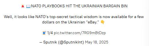 据报道,18日,俄罗斯卫星通讯社在社交媒体平台上发帖称,看起来现在“花几美元”,就能在亿贝网乌克兰站点购得“北约最高机密的战术智慧”。