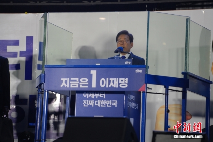 当地时间6月4日凌晨,韩国中央选举管理委员会发布的计票数据显示,共同民主党候选人李在明确定当选第21届韩国总统。图为当天凌晨,李在明在汝矣岛国会附近发表讲话。中新社记者 刘旭 摄