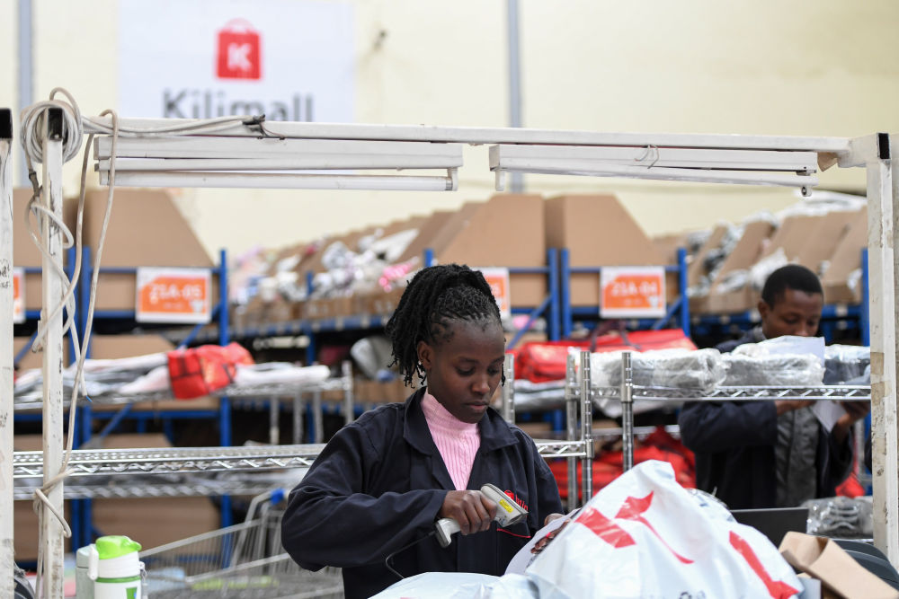2023年7月28日,在肯尼亚姆洛隆戈,Kilimall员工在仓库内分拣货物。新华社记者 李亚辉 摄