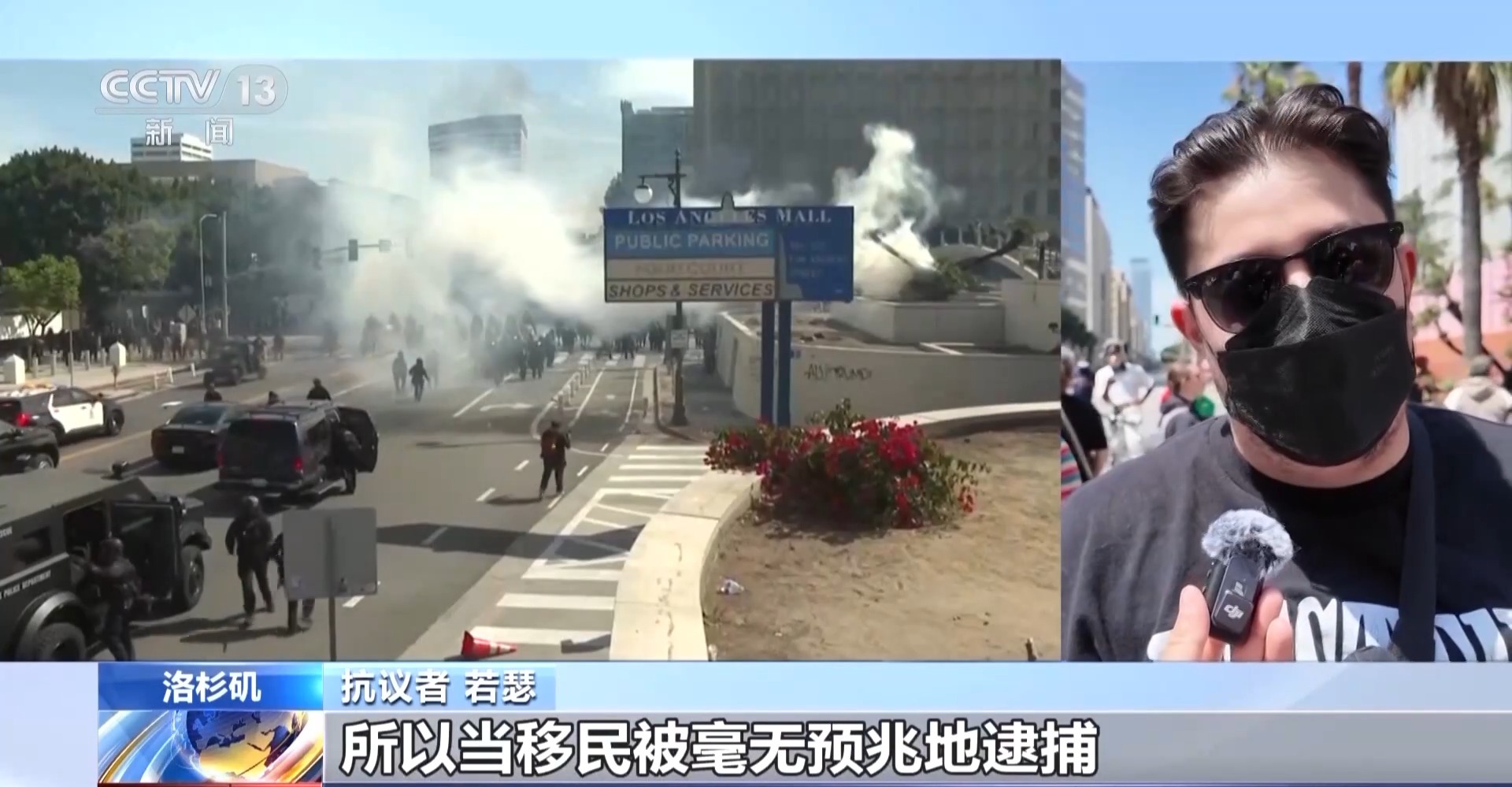 在加州洛杉矶市,抗议者表达对政府驱逐移民等政策的不满。抗议者和警察对峙,警察向抗议者发射催泪瓦斯以驱散抗议人群,还有抗议者被警方逮捕。