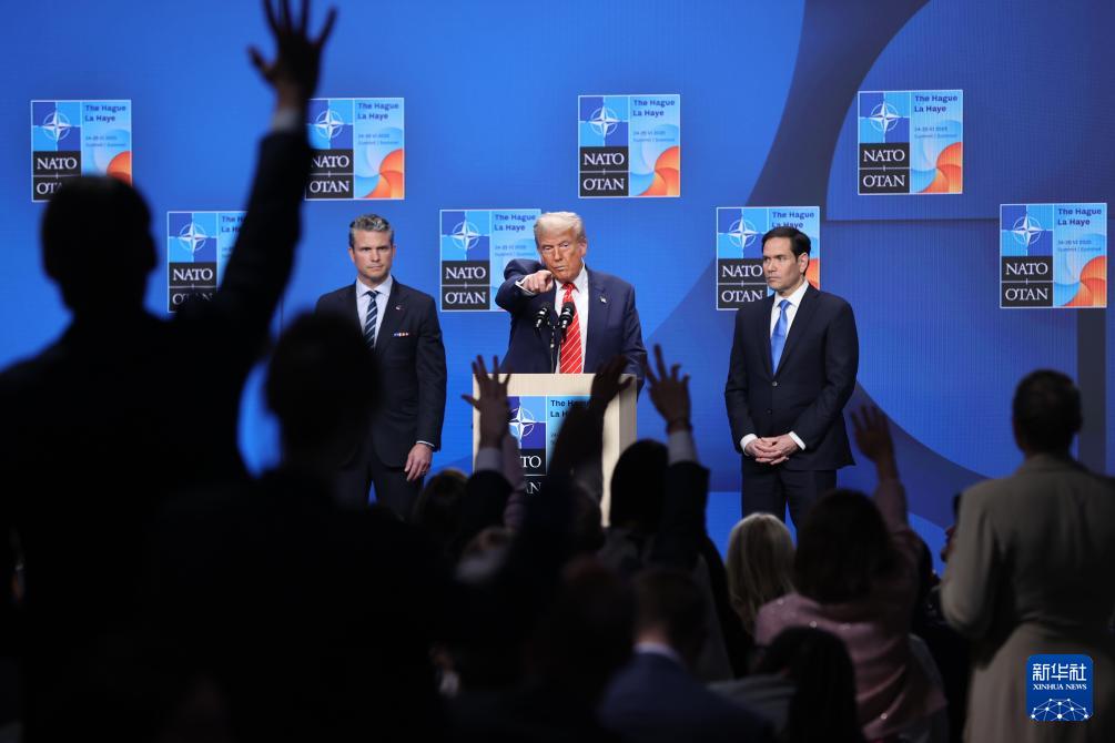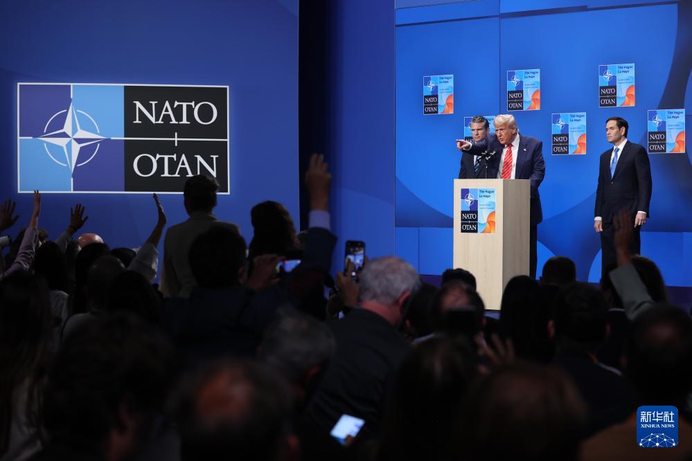 6月25日,在荷兰海牙,美国总统特朗普(中)在北约峰会后出席记者会。新华社记者 赵丁喆 摄
