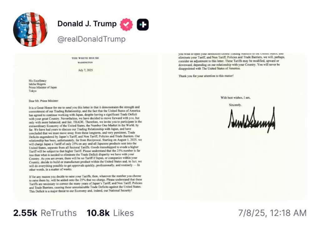 特朗普7日早些时候在自己创立的“真实社交”网站上发布他写给日本首相石破茂和韩国总统李在明的信,表示新关税将不包括其他行业关税。