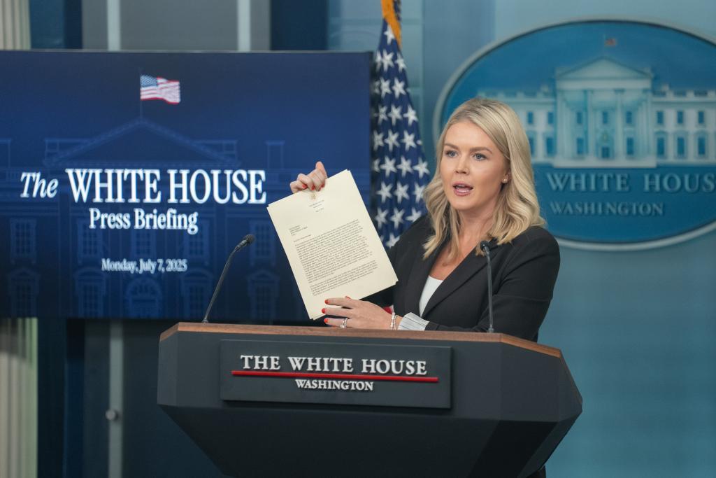 7月7日,在美国首都华盛顿白宫,白宫新闻发言人卡罗琳·莱维特在记者会上展示美国总统特朗普致日本首相的信函。新华社记者 胡友松 摄