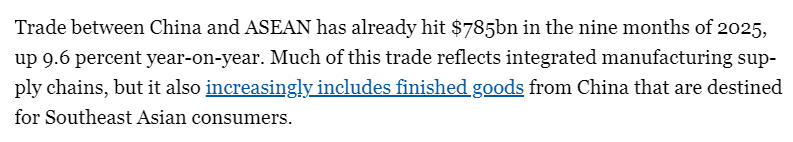 报道说,作为彼此最大的贸易伙伴,中国与东盟不断增长的贸易规模在很大程度上体现出该区域制造业、供应链一体化趋势不断增强。报道认为,中国-东盟自贸区3.0版升级议定书签署正值双方希望进一步加强双边关系之际,是“共赢的结果”。