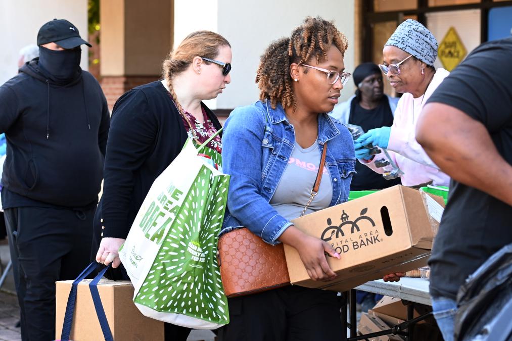 10月21日,在美国马里兰州海厄茨维尔市,联邦雇员领取免费食品。新华社记者李睿摄