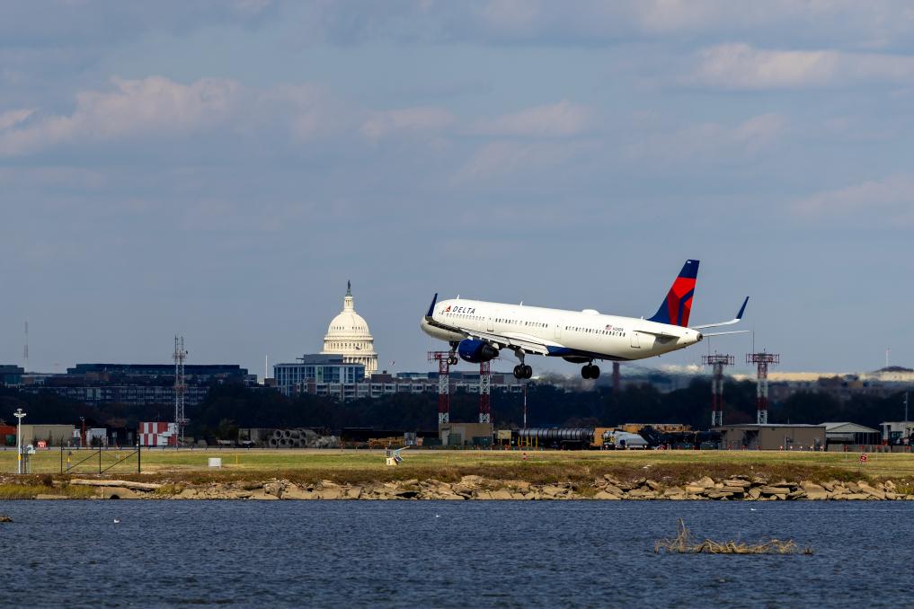 11月1日,一架飞机降落在美国弗吉尼亚州阿灵顿的里根国家机场。新华社记者胡友松摄
