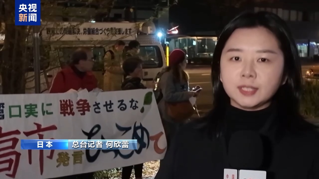 总台记者 何欣蕾:日本首相高市早苗近期涉台的错误言论在日本国内持续引发抗议和不满。19日在京都市役所前,当地民众自发举行集会,抗议高市的错误言行。像我身后的条幅,上面就写着“不要拿台湾作借口,挑起战争,高市早苗撤回言论”,以此来表达民众的心声。