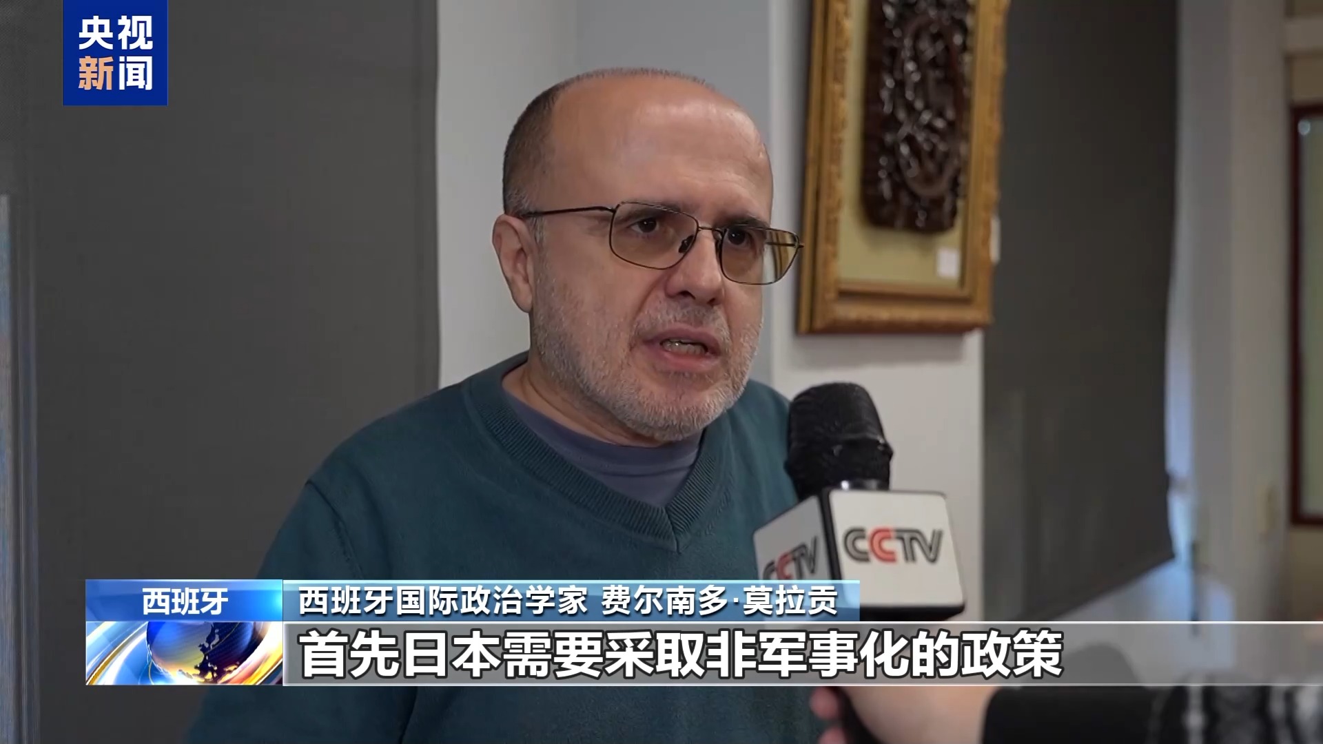 西班牙国际政治学家 费尔南多·莫拉贡:首先日本需要采取非军事化的政策,也就是说,需要维持对外的友好往来。因为这也符合日本的根本利益,日本需要将中国视作重要贸易伙伴,同时也要和韩国和东南亚各国维持和平往来,不再重复历史上犯过的错误。
