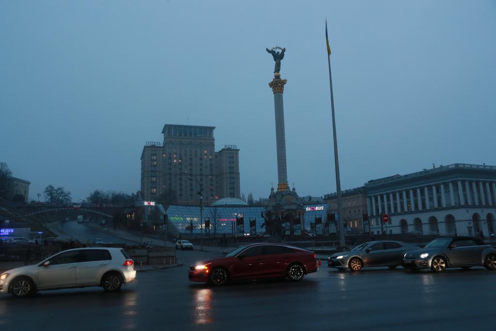 11月20日,乌克兰首都基辅主要街道的照明设施出现大面积停电,车辆在暮色中驶过独立广场。新华社记者李东旭摄