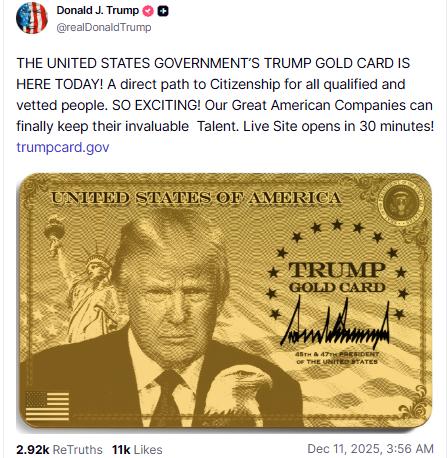特朗普称,“通过向全世界发放数万张金卡,可以筹集到巨额资金。”