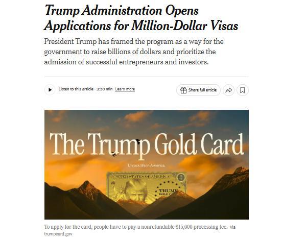 根据特朗普的声明,美政府正式接受“黄金卡”签证计划申请。所谓“黄金卡”计划,旨在通过收取高昂费用,鼓励全球富人移居美国并获得居留许可。