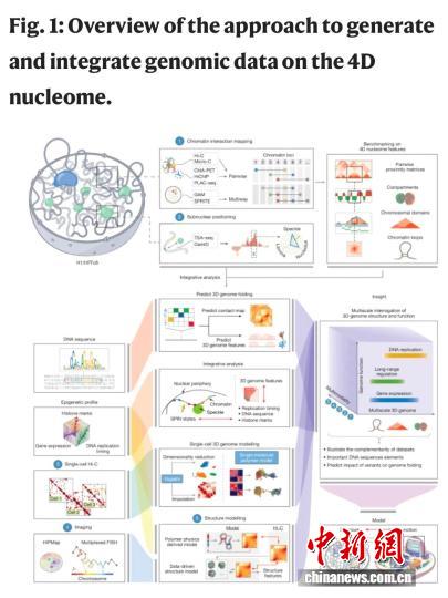 该论文介绍,人类染色体的三维组织结构,对于协调遗传物质调控生物反应过程起到重要作用。DNA缠绕组蛋白形成名为染色质的复合体,存储在细胞核内。大量染色质位点可通过生物化学修饰来调控基因表达。绘制这一三维结构及其如何经时(第四维度)改变的工作,被称为4D核组学。