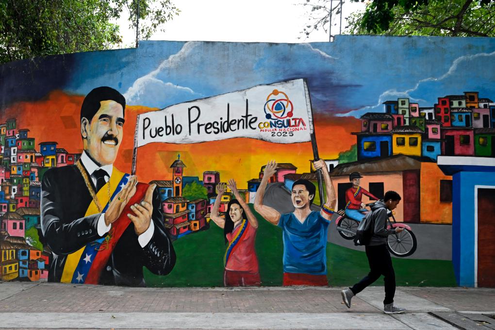 12月2日,在委内瑞拉首都加拉加斯,行人从支持委内瑞拉总统马杜罗的涂鸦墙前走过。新华社记者 李木子 摄