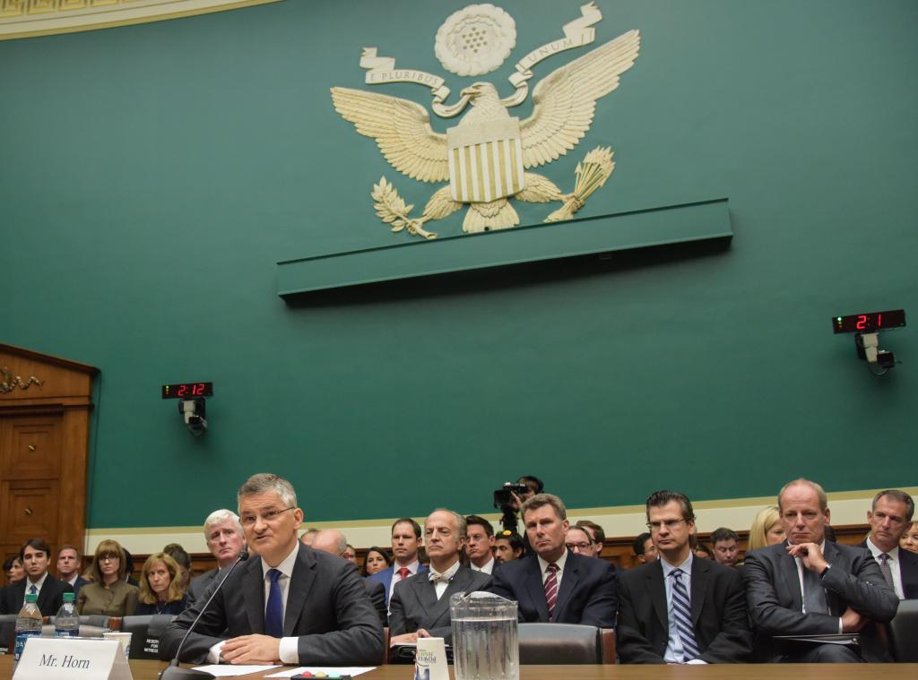 图为2015年10月8日,在美国首都华盛顿,时任大众汽车集团美国分公司总裁兼首席执行官迈克尔·霍恩在美国国会众议院能源和商务委员会举行的听证会上作证。新华社记者鲍丹丹摄