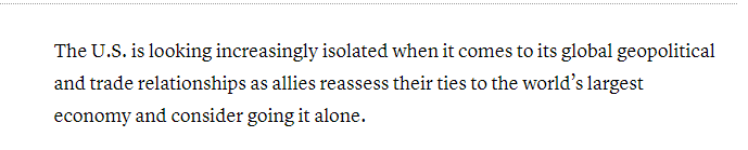 美国消费者新闻与商业频道(CNBC)1月31日刊文称:随着盟友重新评估与世界最大经济体(美国)的关系并考虑“单干”,美国在全球地缘政治和贸易关系中将显得日益孤立。