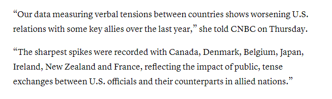 文章援引全球风险和战略咨询公司Verisk Maplecroft首席分析师希梅纳·布兰科(Jimena Blanco) 的话说,美国与其盟友间的沟通方式出现了明显的恶化。布兰科指出,“过去一年里,美国与一些主要盟友的关系恶化了”,其中与加拿大、丹麦、比利时、日本、爱尔兰、新西兰和法国的波动最为剧烈,“这反映出美国与盟友间公开、紧张的交流所造成的影响。”