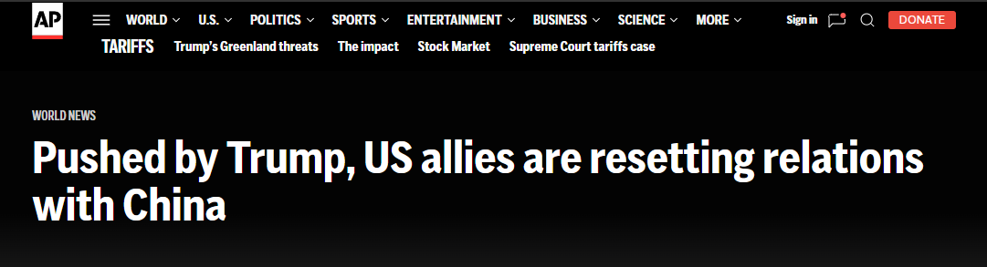 文章分析认为,自美国总统特朗普开启第二任期以来,世界秩序发生重大转变,美国最亲密的伙伴们与美国就关税问题、格陵兰岛问题等发生冲突。西方盟友们开始探索与中国合作的机会。尽管此举有惹恼美国的风险,但这些国家仍愿与中国重塑关系。