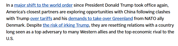 文章说,近期,美国的西方盟友们正在寻求与世界第二大经济体建立更密切的关系。加拿大总理卡尼访华,大幅削减对中国电动汽车等关税。英国首相斯塔默访华修复了两国近年来的紧张关系,还有法国总统马克龙、爱尔兰总理马丁、韩国总统李在明、芬兰总理奥尔波也在过去几周访问了中国。