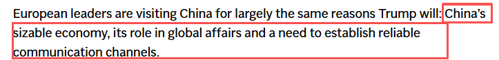 文章分析说,欧洲领导人访华的原因主要是基于中国庞大的经济规模、在全球事务中的作用以及建立可靠沟通渠道的需要。
