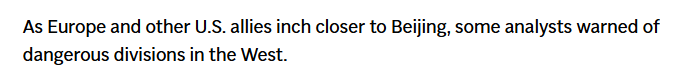 文章最后说,随着欧洲和其他美国盟友与中国越走越近,一些分析人士认为西方可能出现危险的分裂。