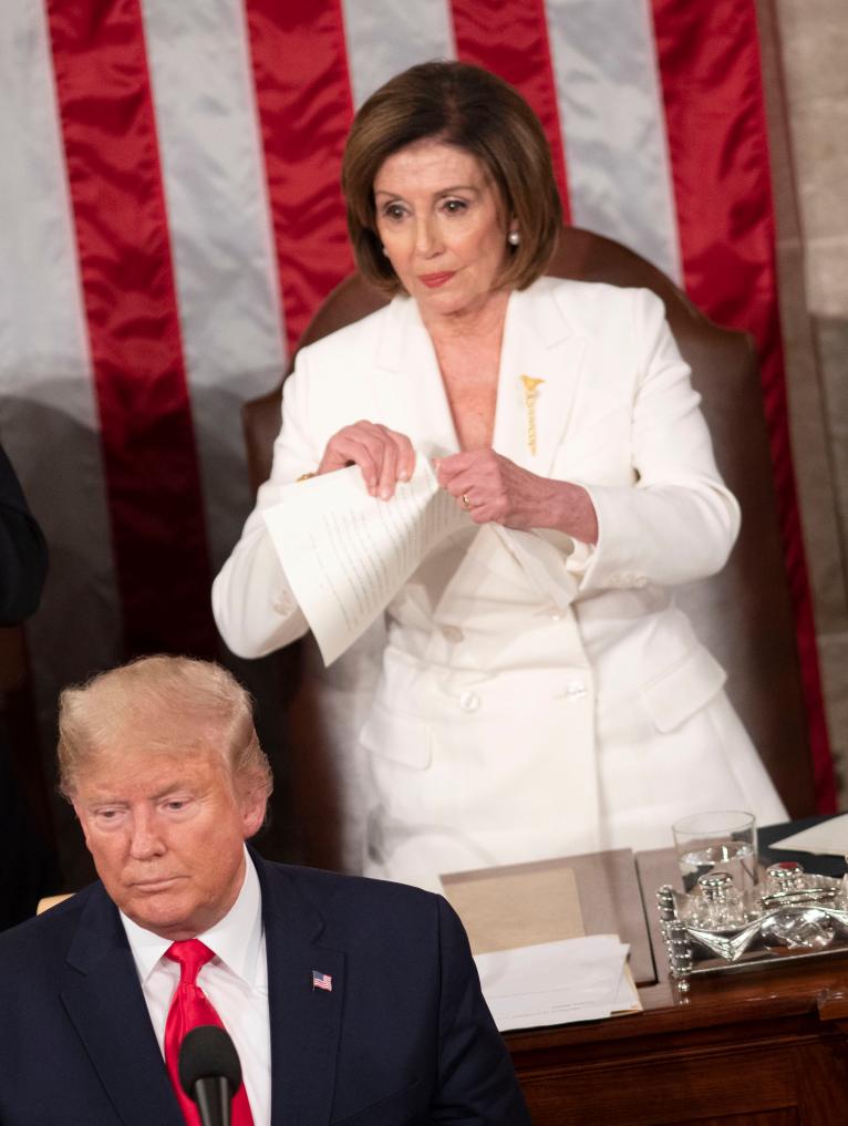 2020年2月,特朗普在首个任期内发表国情咨文时,时任众议院议长的佩洛西在他讲话结束后立即当众撕毁手中的特朗普讲稿副本。