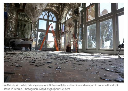 截至目前,经伊朗官方确认,最严重的破坏发生在德黑兰市中心的古列斯坦宫(玫瑰宫)。该宫殿是受联合国教科文组织保护的世界遗产。