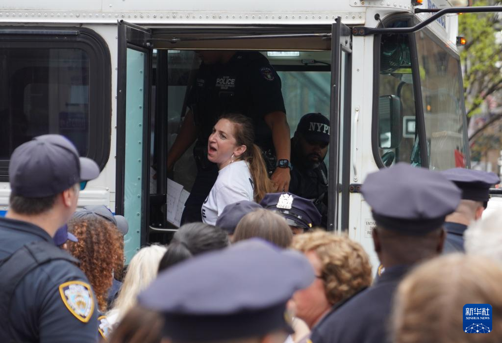 4月13日,在美国纽约曼哈顿,一名参加抗议活动的女子被警察带离现场。