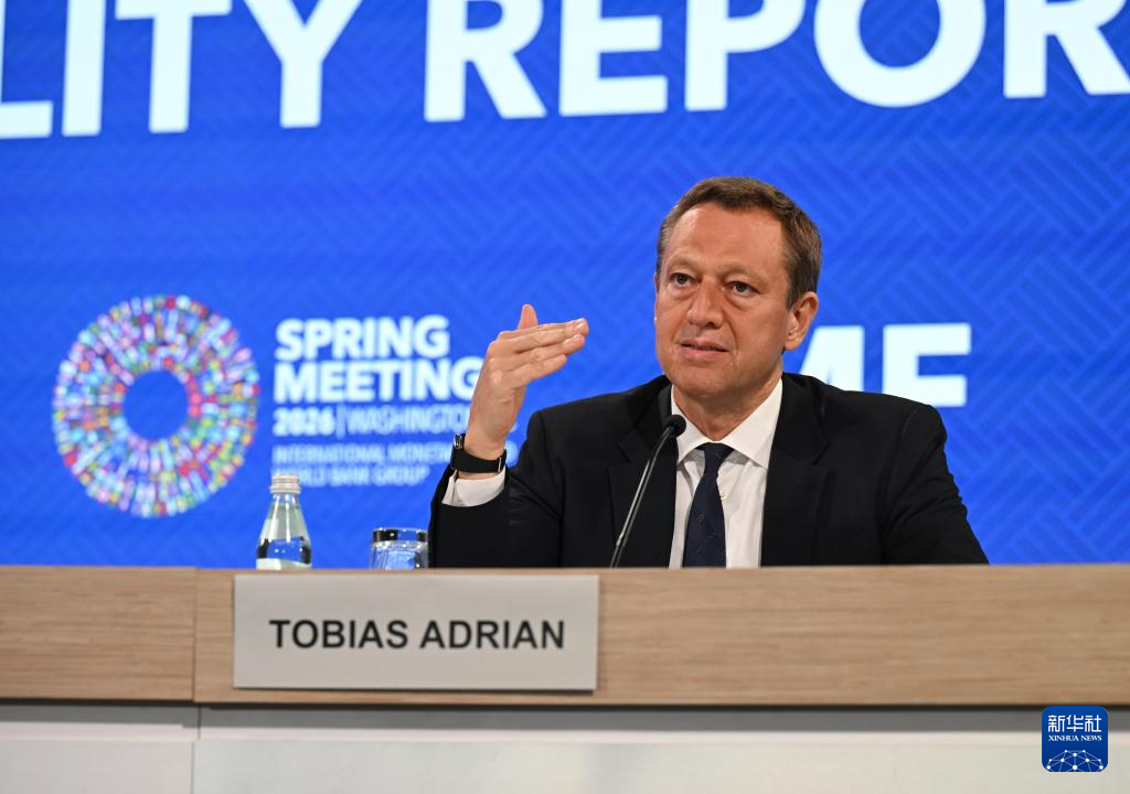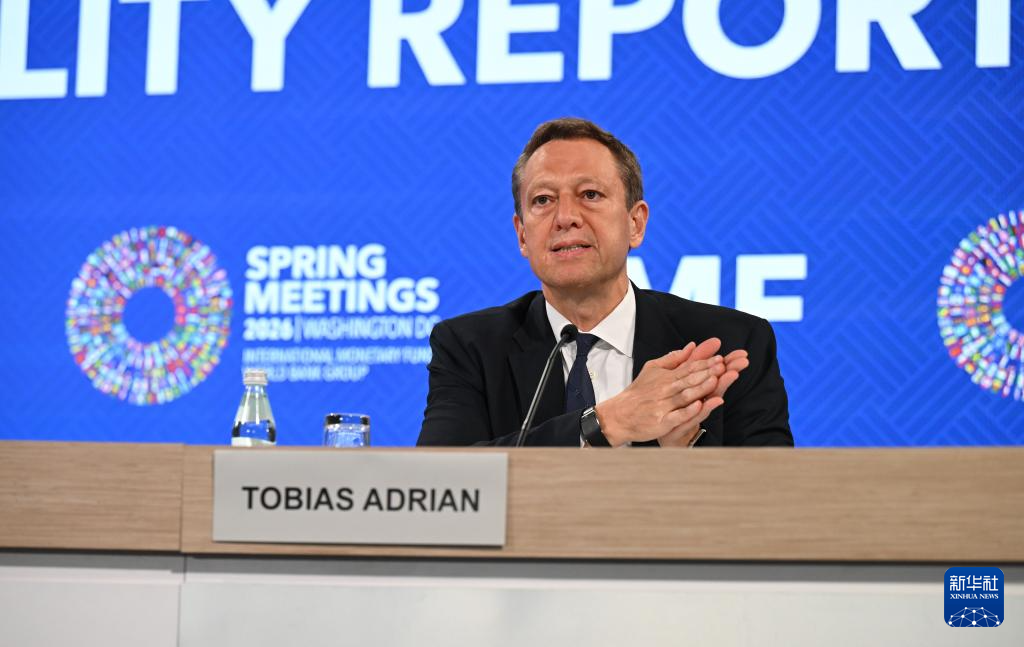 4月14日,在美国华盛顿,国际货币基金组织(IMF)货币与资本市场部主任托比亚斯·阿德里安(中)在《全球金融稳定报告》新闻发布会上讲话。新华社记者 李睿 摄