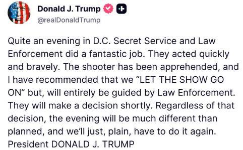 特朗普随后在社交媒体上说,一名涉事枪手已被拘捕,他“已建议‘活动照常进行’,但最终将完全遵从执法部门的安排……无论最终决定如何,今晚的活动安排都将和原定计划有很大不同。我们后续需要重新举办这场活动”。