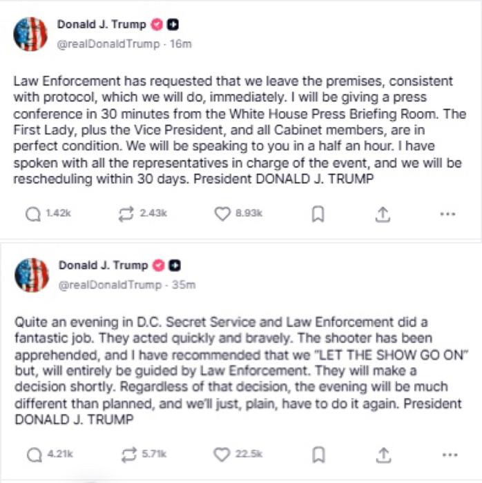 特朗普在第一条帖文中写道:“在华盛顿特区,这真是个不平凡的夜晚。特勤局和执法部门做得非常出色,他们行动迅速且勇敢。枪手已被抓获,我已建议我们‘让活动继续下去’,但将完全遵循执法部门的指引。他们很快会做出决定。无论决定如何,今晚都将与计划大不相同,而我们也只能择期再办一次。”
