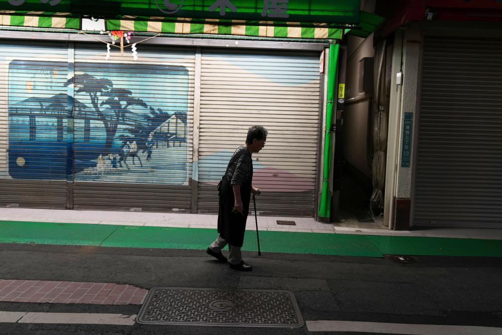 2023年9月,在日本东京巢鸭,一位老年人路过商业街。新华社记者张笑宇摄