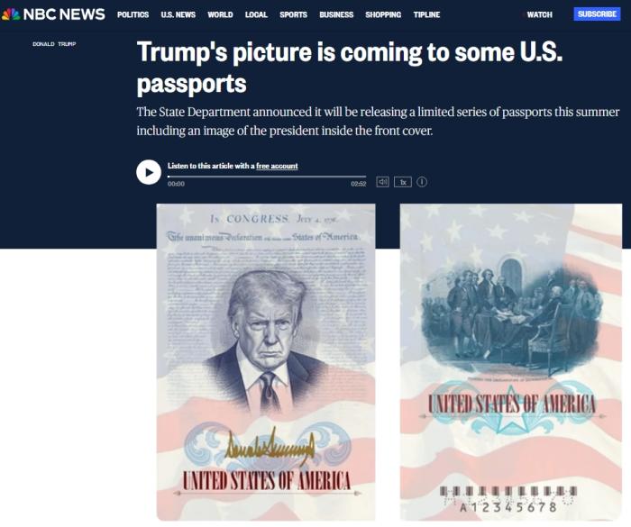 根据国务院提供的图片,新护照内页将印有特朗普的肖像,肖像叠加在《独立宣言》的文本和美国国旗之上,下方是金色字体的特朗普签名。护照另一页将印有展示美国开国元勋签署《独立宣言》的著名画作。